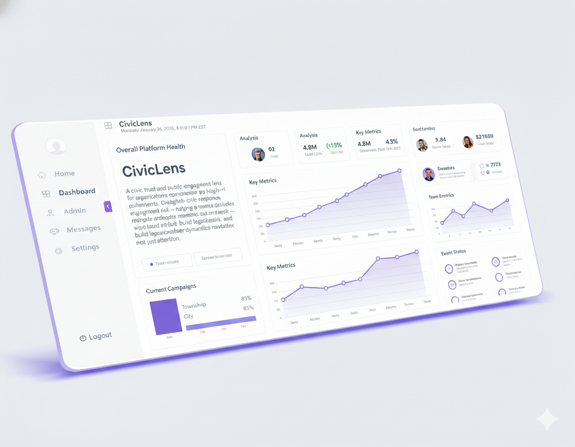 A civic trust and public-engagement lens for organizations operating in high-scrutiny, polarized environments. CivicLens provides structured insight into civic response, trust signals, and engagement risk — helping teams anticipate audience reaction, reduce backlash, and communicate in ways that build legitimacy, not just attention. Designed for public sector, advocacy, coalition, and mission-led organizations navigating complex stakeholder dynamics.